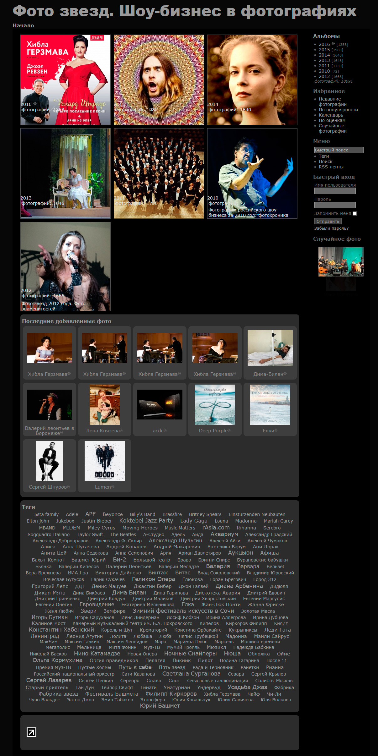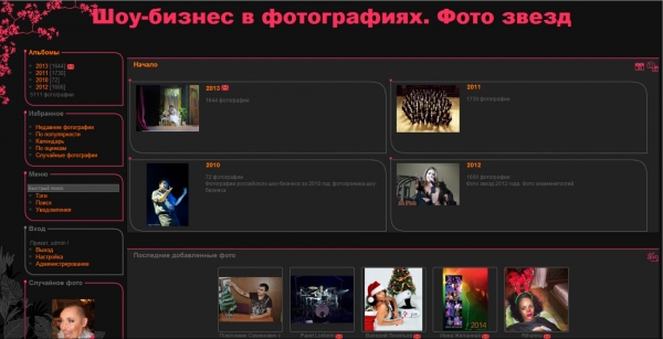 Создана как база фотографий шоу-бизнеса из разных источников. Представляет собой галерею с удобным тегированием и поиском. Не интернет-магазин. Снабжена защитой от спама, масштабируется до полноценного фотохостинга. Имеет систему извлечения EXIF информации из фото (выдержку, диафрагму, оригинальный размер, автора, описание и т.д.). Опционально снабжен слайд-проекцией и корзиной.