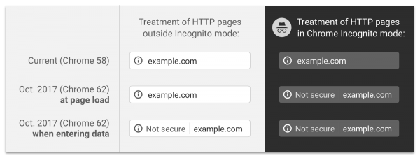 «Когда пользователи просматривают Chrome с помощью режима инкогнито, они, вероятно, увеличивают свои ожидания конфиденциальности. Тем не менее, просмотр HTTP не является закрытым для других в сети, поэтому в версии 62 Chrome также предупреждает пользователей при посещении страницы HTTP в режиме инкогнито о небезопасности.