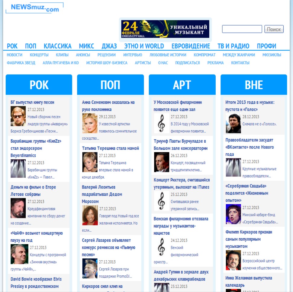 Ведущее российское СМИ по новостям музыки и шоу-бизнеса. Согласно желанию заказчика, весь контент четко поделен на музыкальные жанры. Встроен функционал комментирования, рейтингования, социальной сети. Удобная система тегирования, корректный подбор контекстных новостей, мощное кэширование. Создан как высоконагрузочная система, рассчитанная на высокую посещаемость. Многоступенчатая система защиты от взлома и спама.