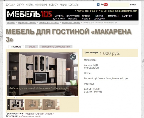 Сайт позволяет выбрать мебель. Присутствуют разделы новостей, новинок, хитов продаж. Карточка товара позволяет загрузить любое количество фотографий товара, изображений цветов отделки, файлы инструкций, для модульной мебели предусмотрено автоматическое создание таблиц из изображений модулей и их цены. Предусмотрены специальные цены для распродаж и акций.